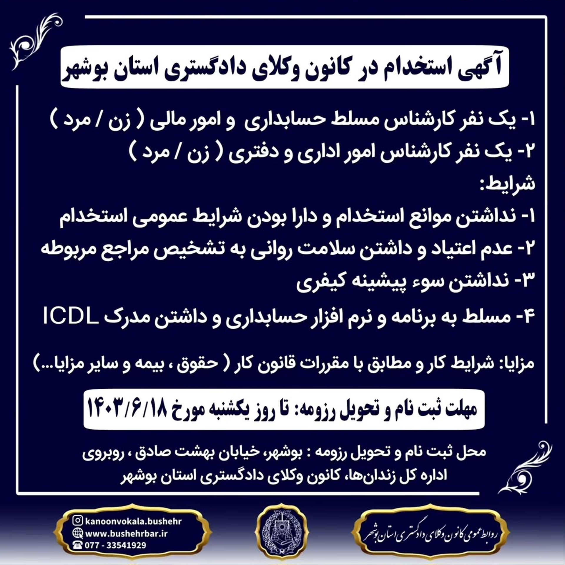آگهی استخدام در کانون وکلای دادگستری استان بوشهر