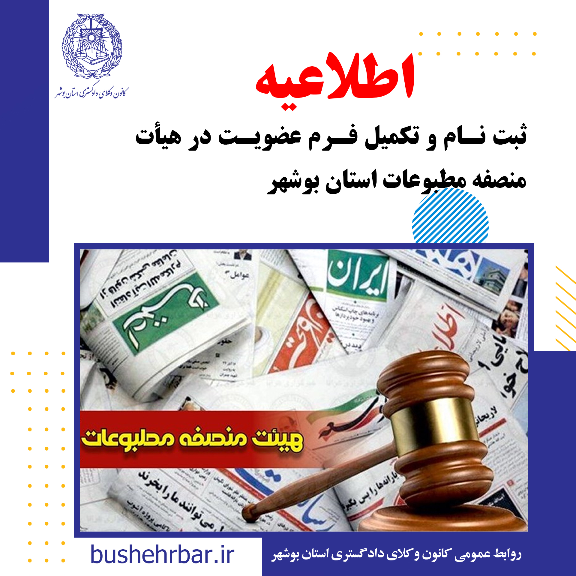 اطلاعیه ثبت نام و تکمیل فرم عضویت در هیأت منصفه مطبوعات استان بوشهر