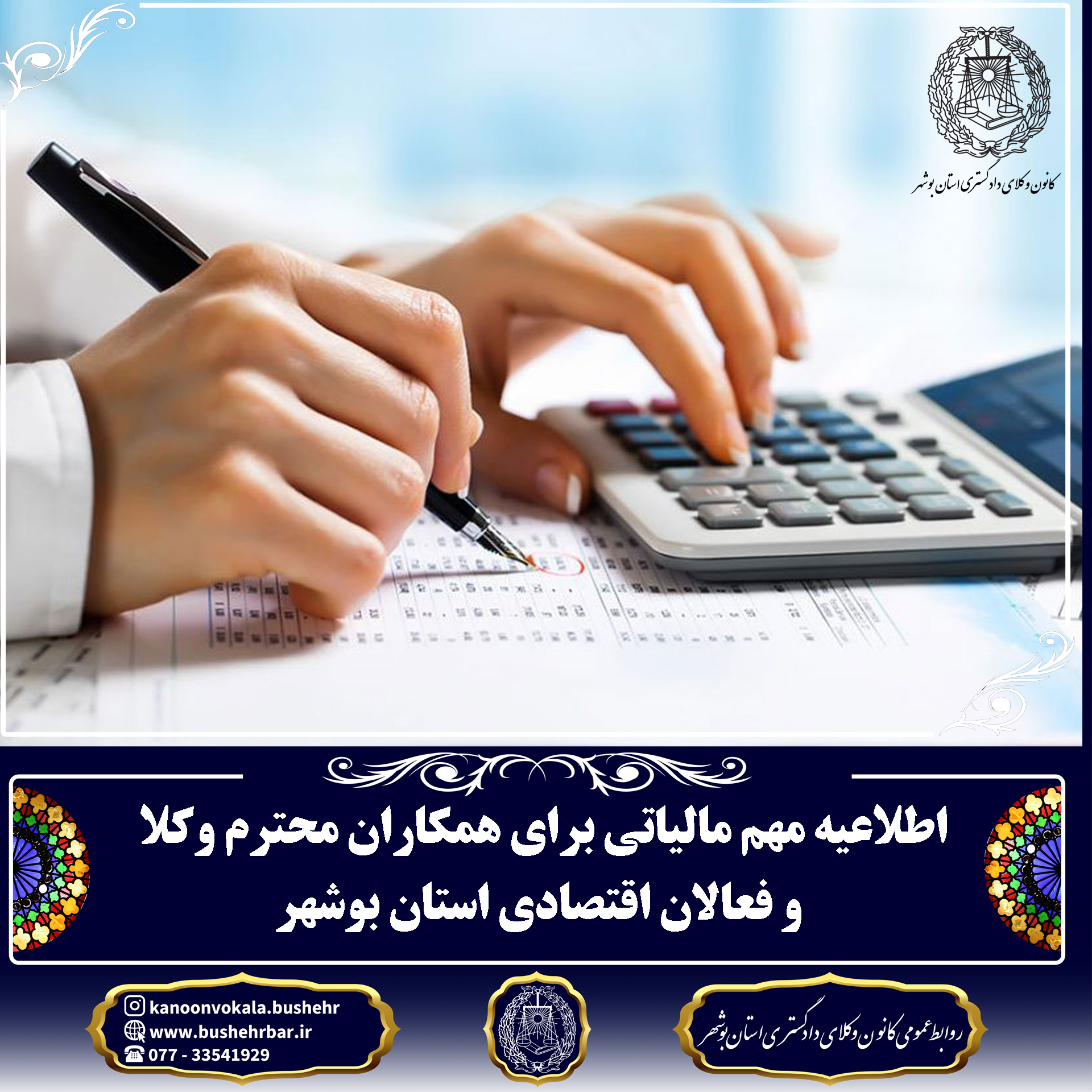 اطلاعیه مهم مالیاتی برای همکاران محترم وکلا و فعالان اقتصادی استان بوشهر