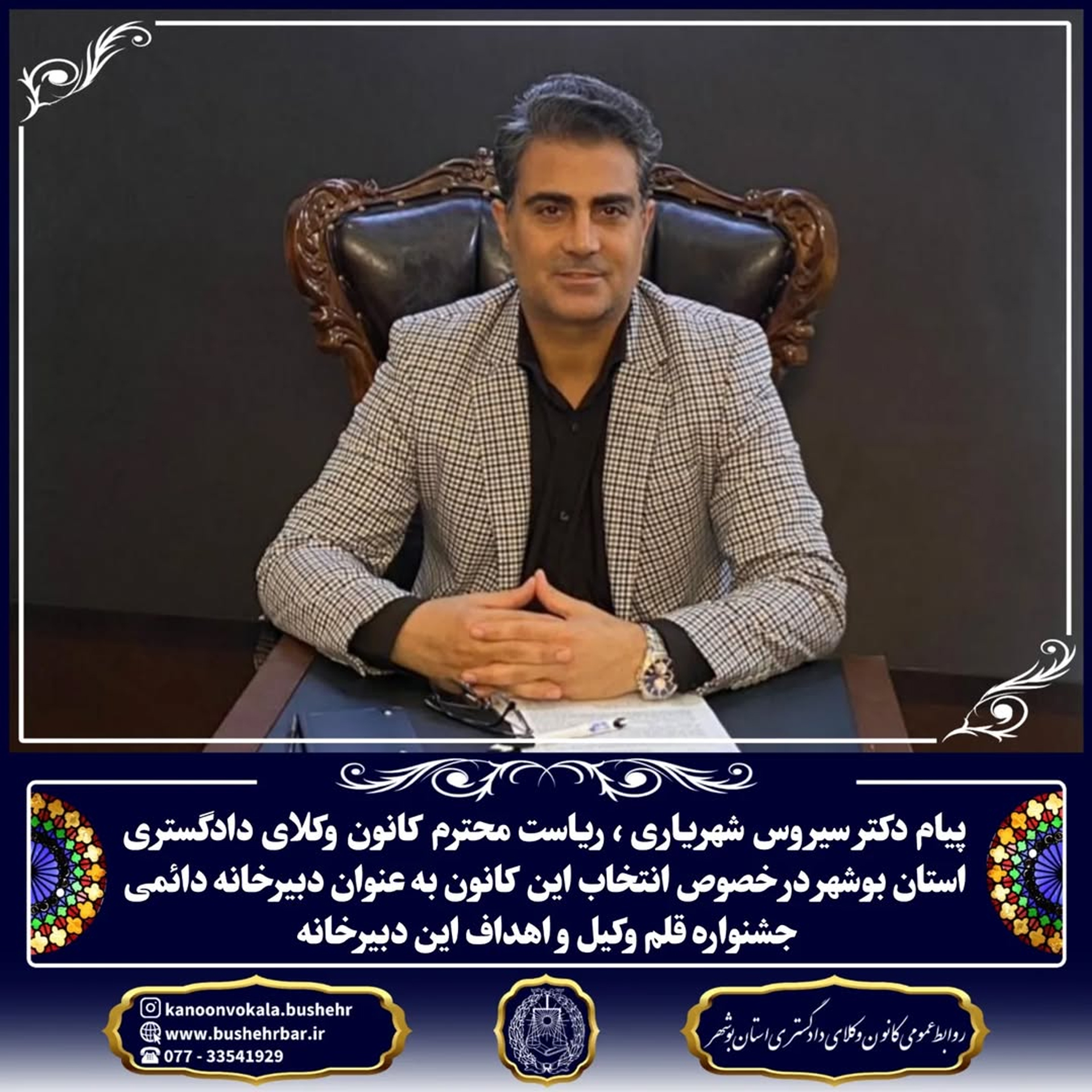 پیام دکتر سیروس شهریاری ، ریاست محترم کانون وکلای دادگستری استان بوشهر در خصوص انتخاب این کانون به عنوان دبیرخانه دائمی جشنواره قلم وکیل و اهداف این دبیرخانه