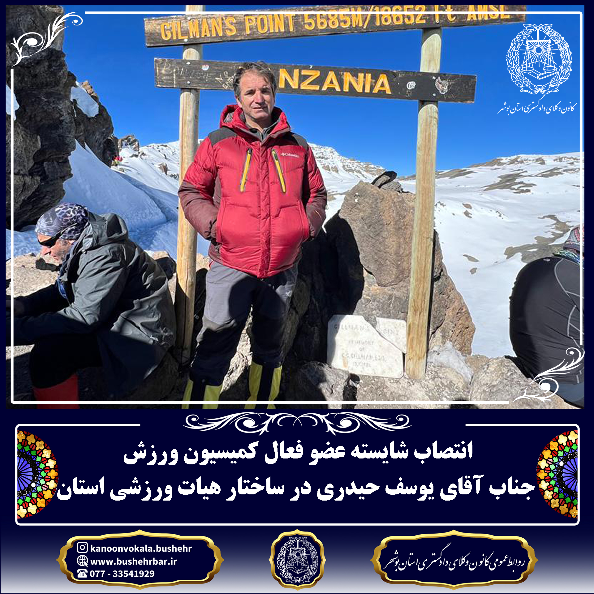 با افتخار به اطلاع میرساند جناب آقای وکیل یوسف حیدری، از اعضای کمیسیون ورزش کانون وکلای دادگستری استان بوشهر، طی حکمی از سوی آقای مسعود احمدزاده، رئیس هیأت کوهنوردی و صعودهای ورزشی استان بوشهر، به عنوان مسئول کمیته انضباطی و حقوقی این هیأت منصوب شد.