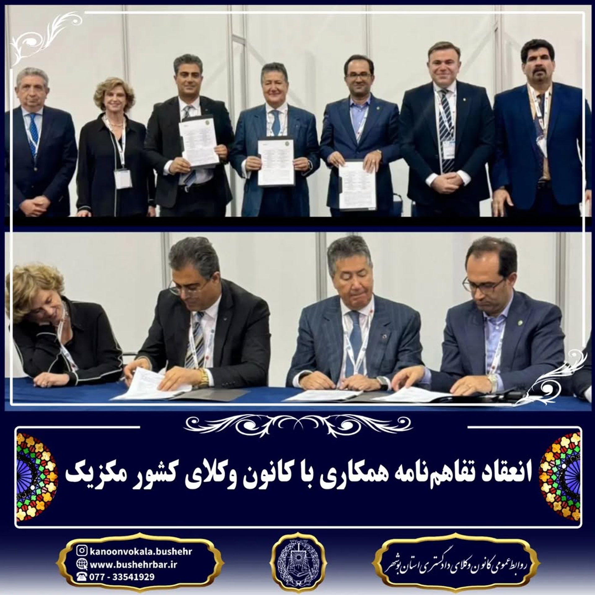 در تاریخ بیستم سپتامبر ۲۰۲۴ در راستای ایجاد یک رابطه حرفهای خاص ، تفاهم نامه همکاری نزدیک بین کانون وکلای دادگستری استان بوشهر ، مرکز و کرمانشاه با کانون وکلای دادگستری کشور مکزیک منعقد گردید.