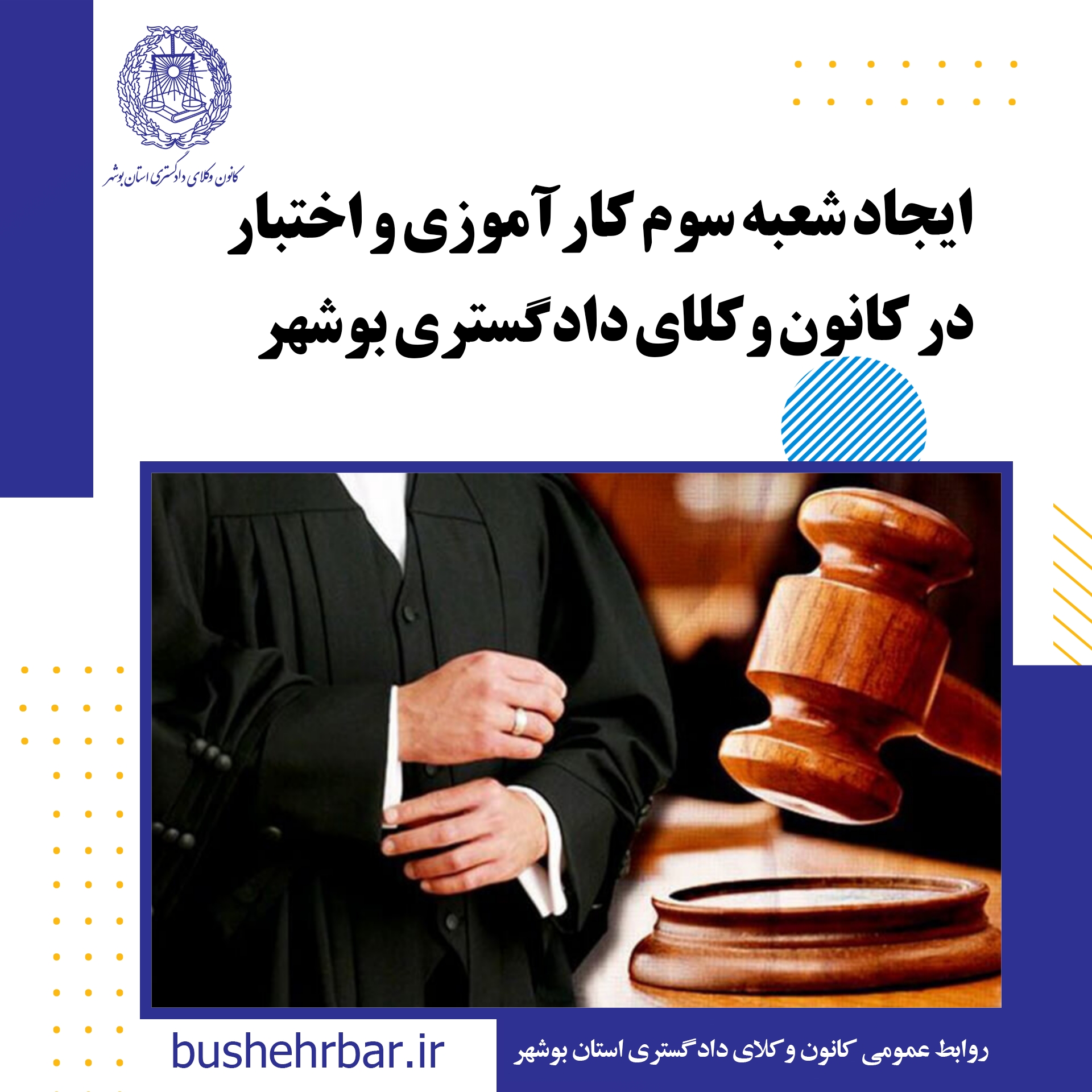 بهمنظور ارتقای کیفی فرآیند آموزش کارآموزان وکالت، بهرهگیری بهینه از ظرفیتهای علمی موجود و حرکت به سوی الگوهای نوین آموزشی، شعبه سوم کارآموزی و اختبار در کانون وکلای دادگستری استان بوشهر تشکیل شد.