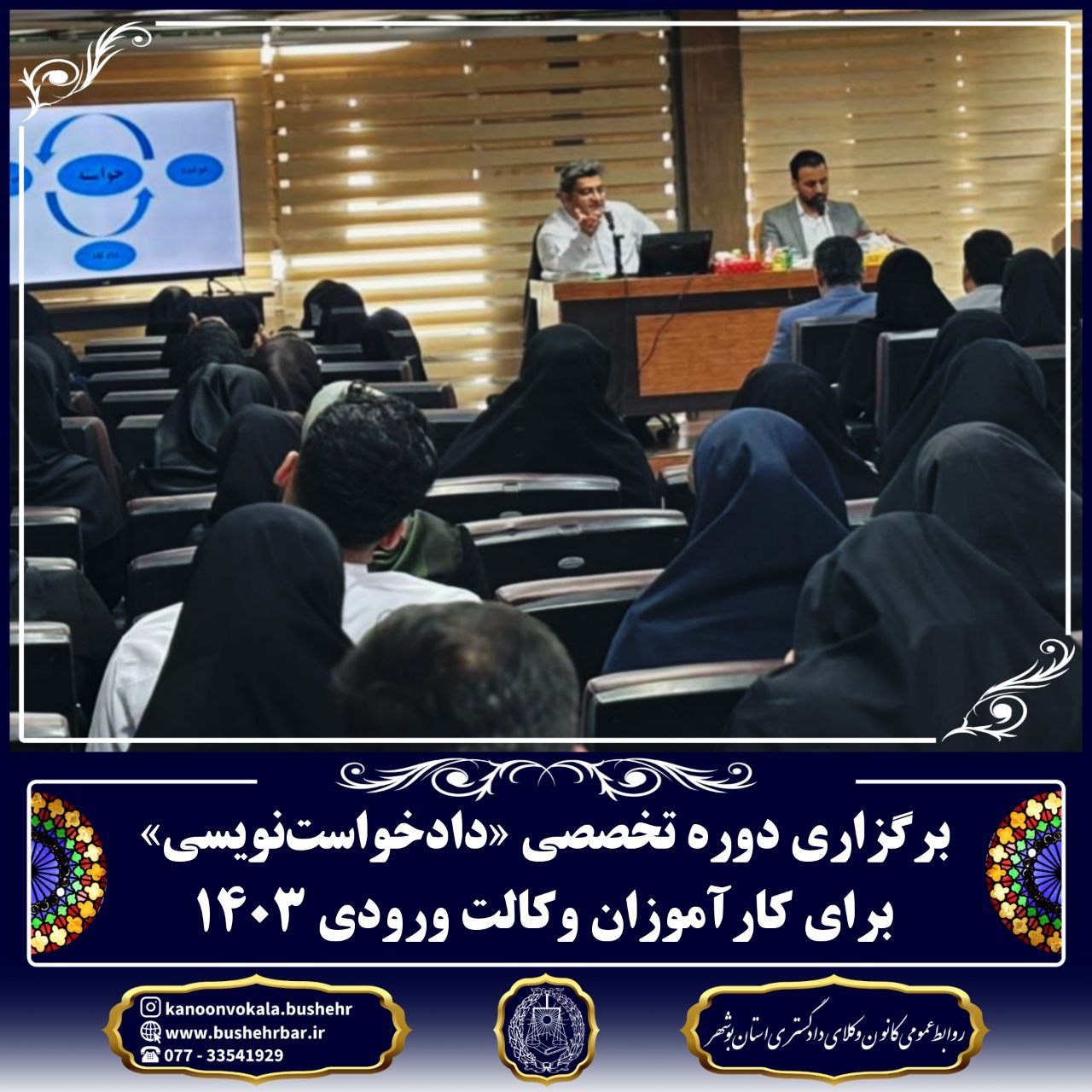 به همت کمیسیون کارآموزی و اختبار کانون وکلای دادگستری استان بوشهر، دوره تخصصی هشتساعته «دادخواستنویسی» ویژه کارآموزان ورودی ۱۴۰۳ برگزار شد.