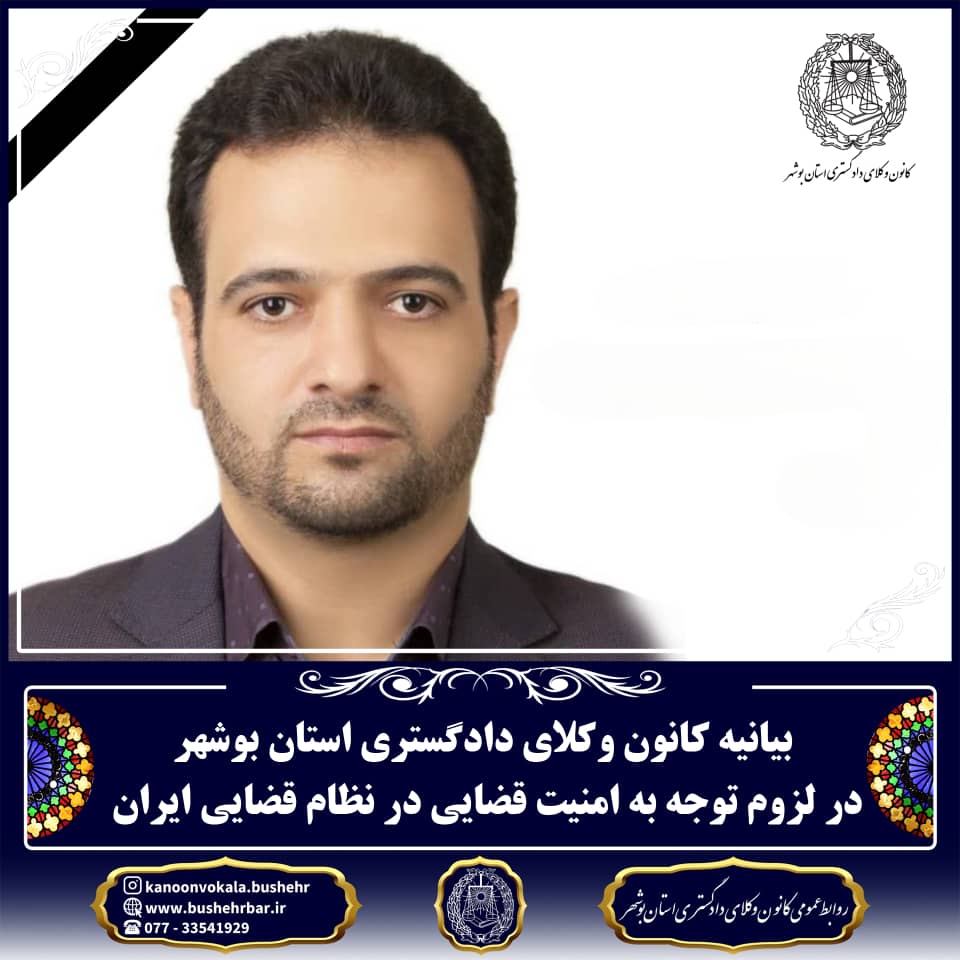 کانون وکلای دادگستری استان بوشهر ضمن محکومیت قاطع این اقدام ، به خانواده داغدار آن مرحوم، به همکاران قضایی دادگستری و به تمامی وکلای گرامی که این قاضی محترم را از نزدیک میشناختند، با ایشان هم محلی بوده وهمچنین به همکاران محترم وکیل در استان فارس و دیگر نقاط کشور که از همراهی حرفهای و دوستی انسانی با آن مرحوم برخوردار بودهاند، بهویژه جناب آقای شایانی، عضو محترم هیئت مدیره کانون وکلای دادگستری استان بوشهر که از بستگان نسبی آن مرحوم مغفور است ، صمیمانهترین مراتب همدردی و تسلیت خود را ابراز میدارم.