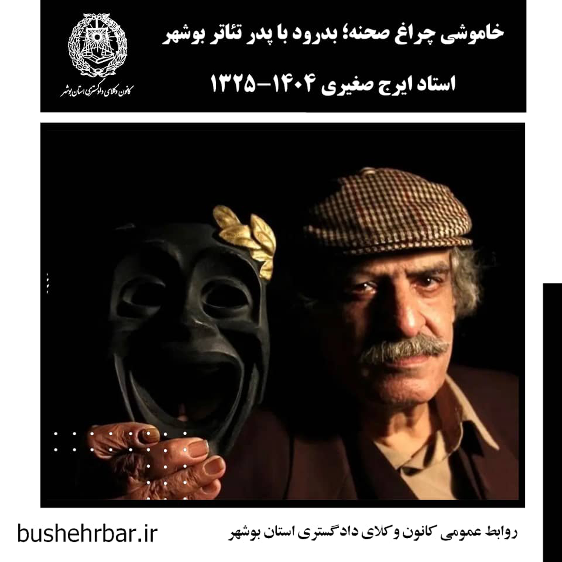 استاد ایرج صغیری، پدر تئاتر بوشهر، هنرمندی بیبدیل و خالق آثاری که روح و رنگ فرهنگ جنوب ایران را به صحنه آورد، اکنون خاموش شد. او با دستانی پر از عشق و ذهنی سرشار از خلاقیت، آیینها و سنتهای بومی را در قالب تئاتر بازآفرینی کرد و نسلی از هنرمندان و مخاطبان را با فرهنگ و هنر ایران آشنا ساخت. «قلندرخونه» و دیگر آثارش، هر یک پلی بود میان گذشته و امروز، میان فرهنگ مردمی و هنر جهانی.