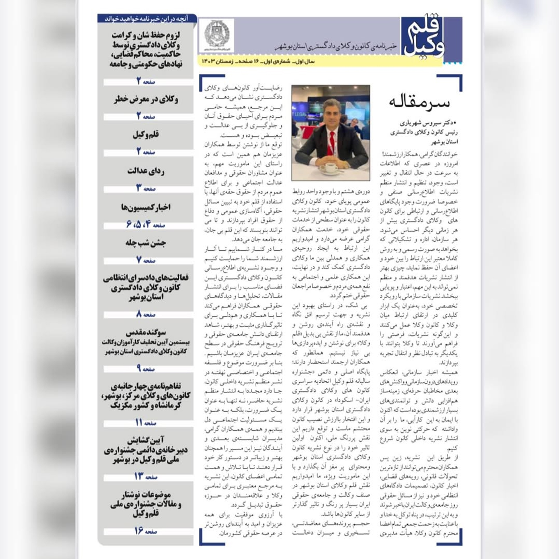 اولین خبرنامهی کانون وکلای دادگستری استان بوشهر در تاریخ ۷ اسفند ۱۴۰۳ همزمان با مراسم گرامیداشت هفتاد و دومین سالروز استقلال کانونهای وکلای کشور رونمایی و منتشر شد. نسخهی الکترونیک این خبرنامه نیز در گروههای حقوقی منتشر گردید. امید است با قلمهای خود و ارسال مطالب ارزشمندتان، ما را در انتشار این خبرنامه باری نمایید.