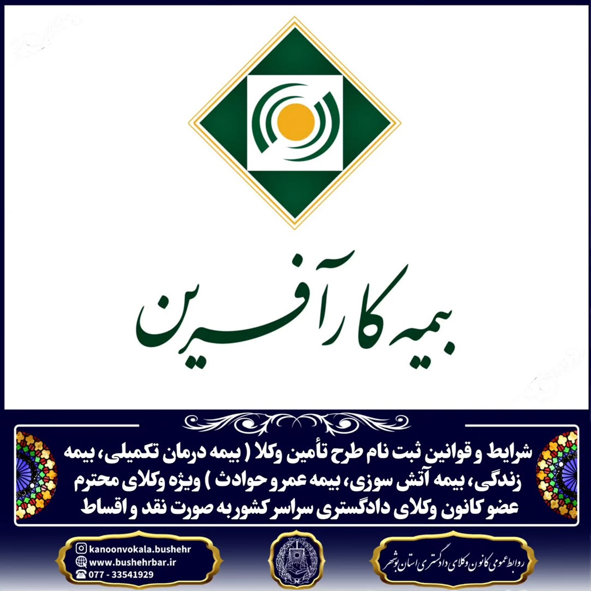 شرایط و قوانین ثبت نام طرح تأمین وکلا ( بیمه درمان تکمیلی، بیمه زندگی، بیمه آتش سوزی، بیمه عمر و حوادث ) ویژه وکلای محترم عضو کانون وکلای دادگستری سراسر کشور به صورت نقد و اقساط