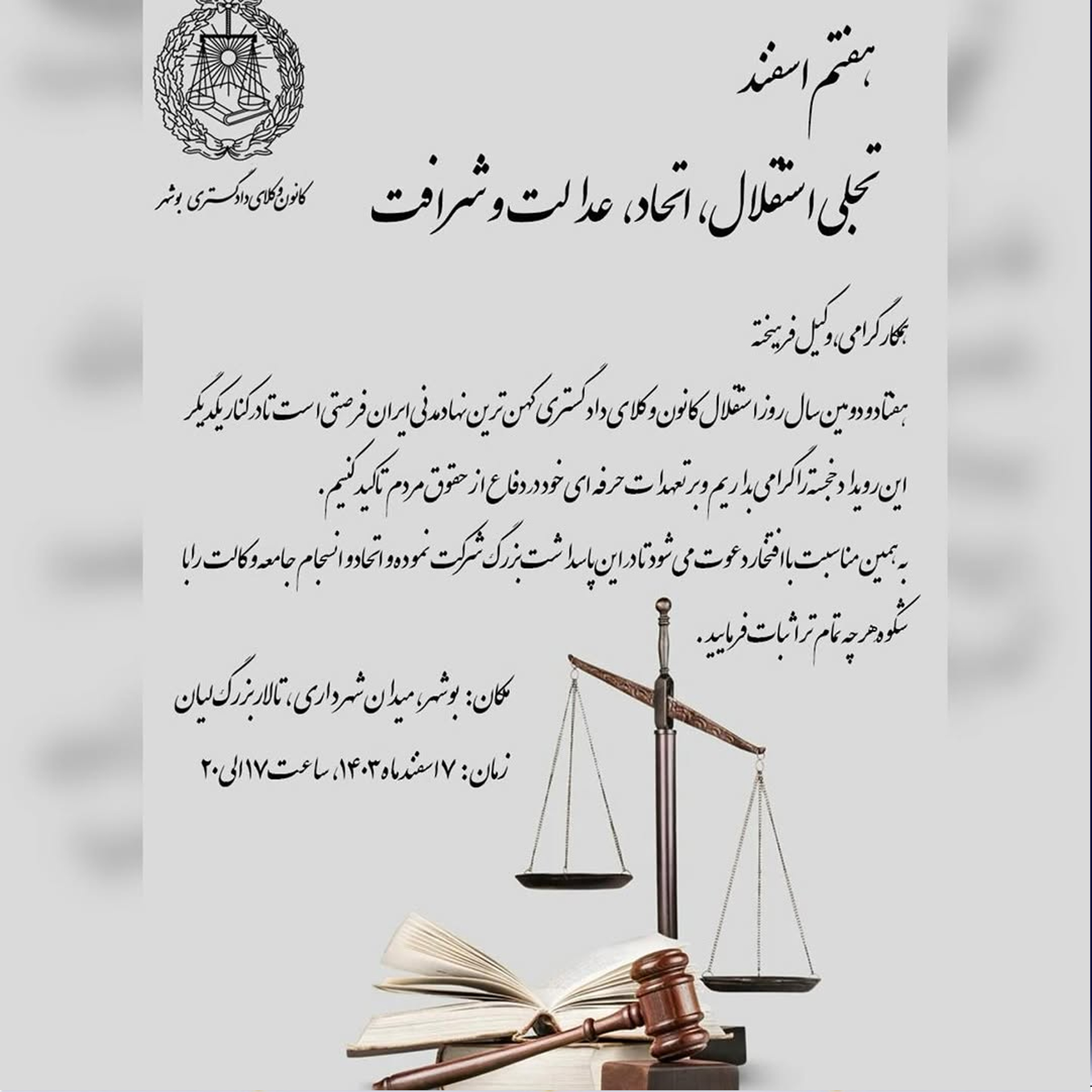 همکاران گرامی و وکلای فرهیخته با افتخار از شما دعوت میکنیم در مراسم بزرگ پاسداشت هفتاد و دومین سالروز استقلال کانونهای وکلای دادگستری کشور