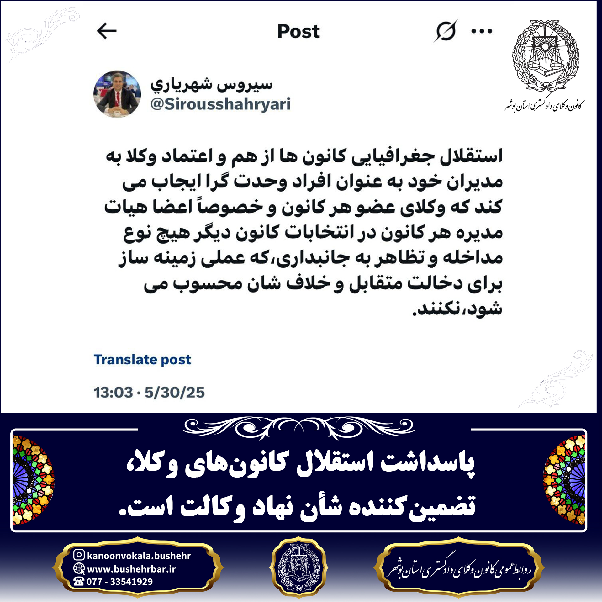در توییتی از دکتر سیروس شهریاری، رئیس کانون وکلای دادگستری استان بوشهر آمده است: