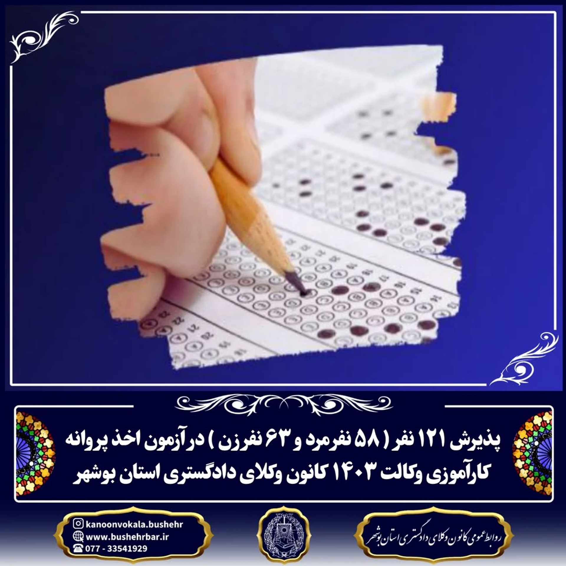 پذیرش 121 نفر در آزمون اخذ پروانه کارآموزی وکالت 1402 کانون وکلای دادگستری استان بوشهر