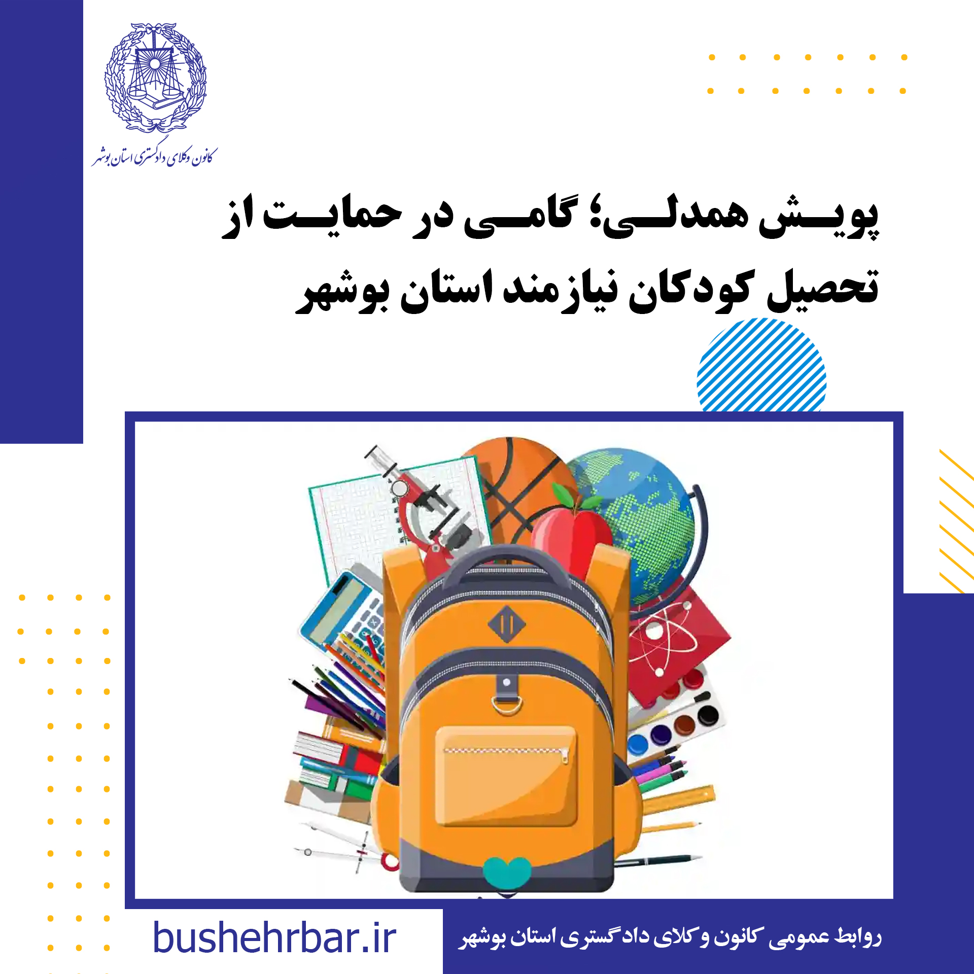 کانون وکلای دادگستری استان بوشهر در راستای رسالت اجتماعی و ایفای مسئولیتهای عمومی خود، پویشی را برای حمایت از دانشآموزان نیازمند روستاهای دور افتاده استان آغاز نموده است. هدف از این پویش، یاریرساندن به فرزندان محروم این استان در مسیر علمآموزی و فراهم آوردن شرایطی برابر برای تحصیل آنان است. اقلام مورد نیاز در این پویش شام لوازمالتحریر (دفتر، خودکار، مداد و…)،کتابهای درسی سالهای گذشته،کتابهای کمکدرسی، کتابهای داستانی و معلومات عمومی مناسب و پوشاک مناسب دانشآموزان تا پایه نهم ، می باشد.