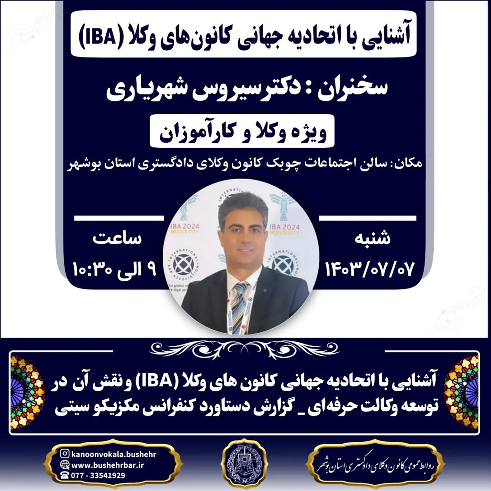 مکان: سالن اجتماعات چوبک کانون وکلای دادگستری استان بوشهر