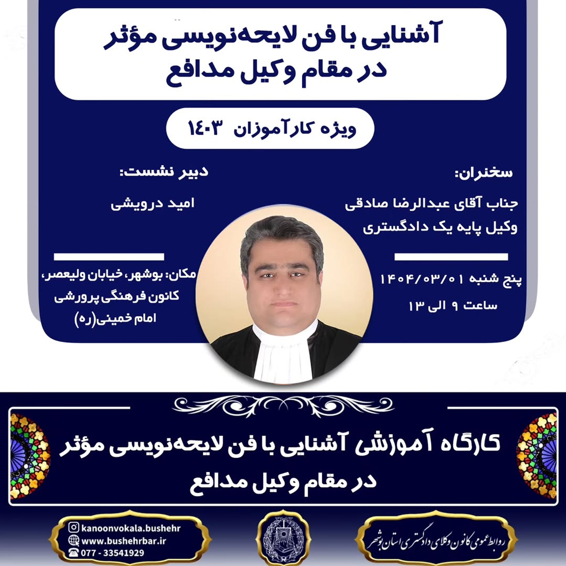 کارگاه آموزشی آشنایی با فن لایحهنویسی مؤثر در مقام وکیل مدافع