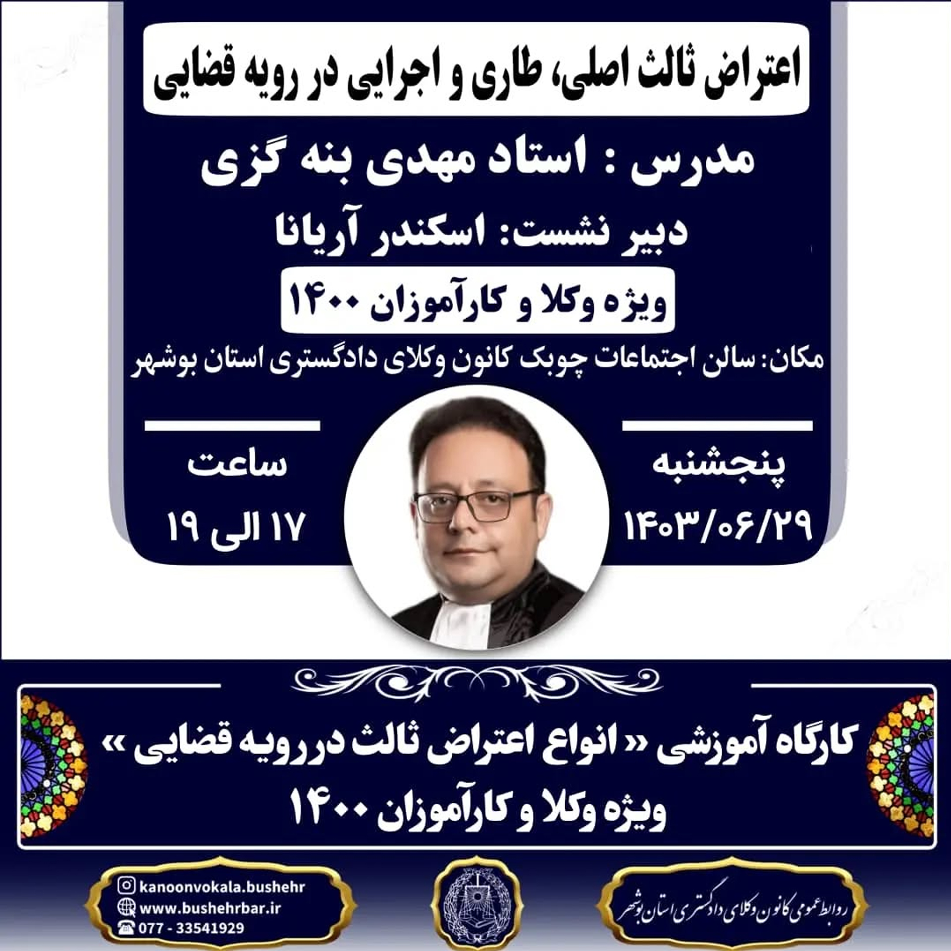 مکان : سالن اجتماعات چوبک کانون وکلای دادگستری استان بوشهر