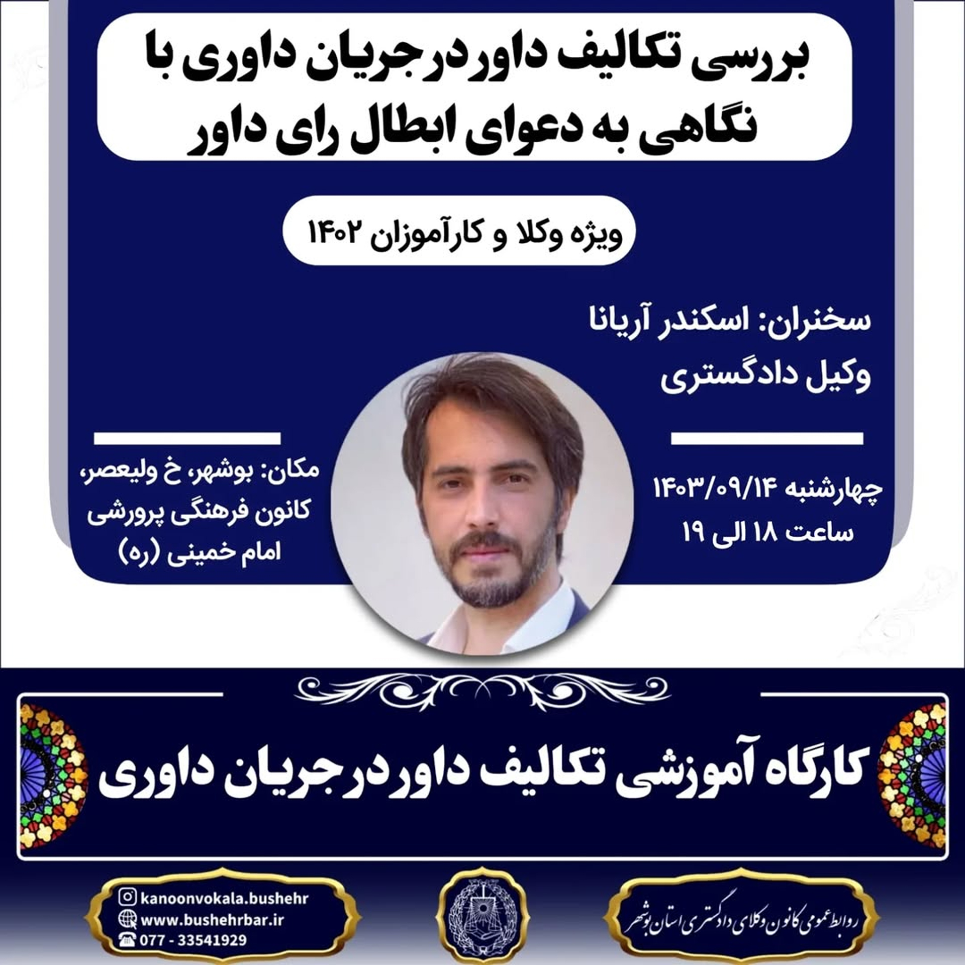 کارگاه آموزشی بررسی تکالیف داور در جریان داوری با نگاهی به دعوای ابطال رای داور