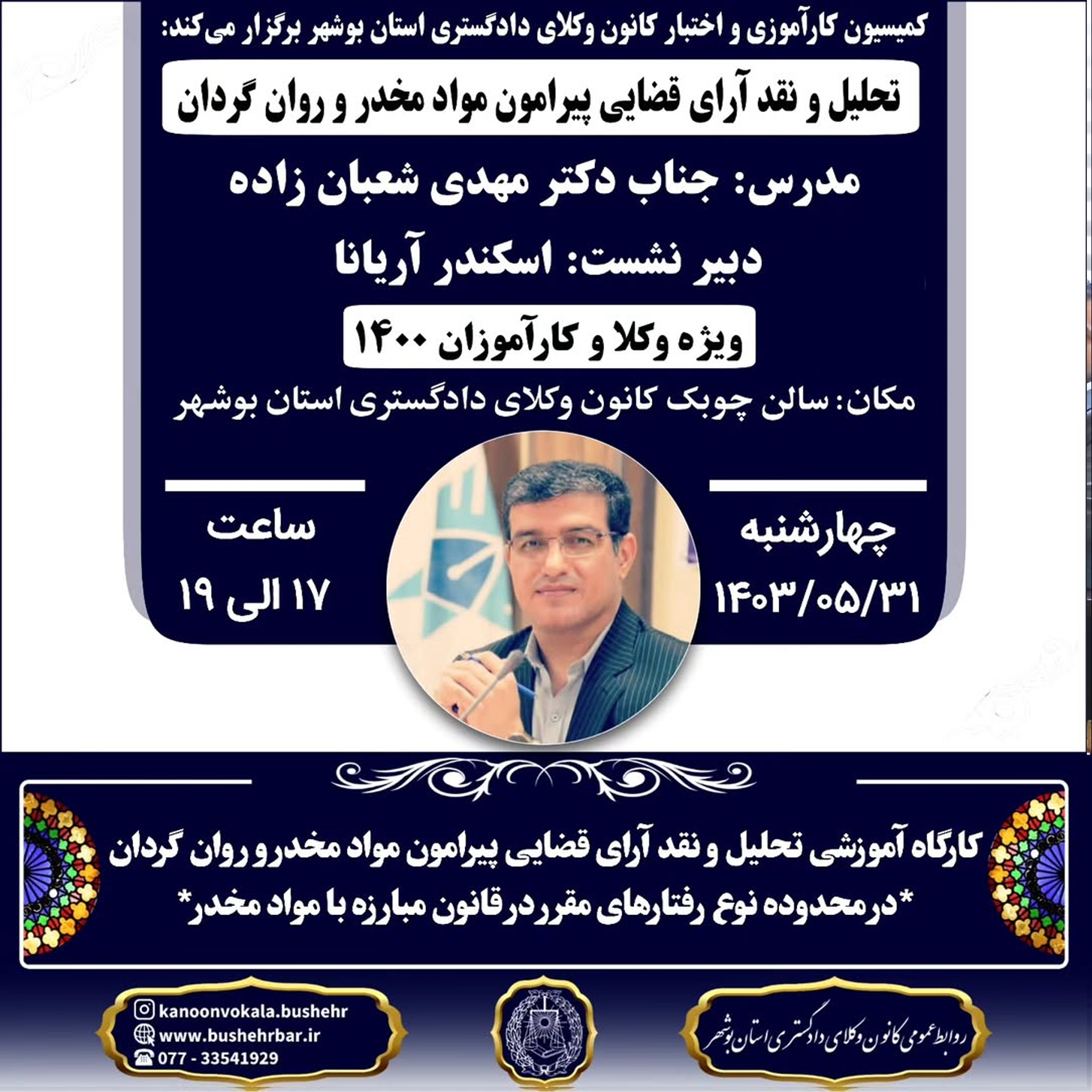 مکان : سالن چوبک کانون وکلای دادگستری استان بوشهر