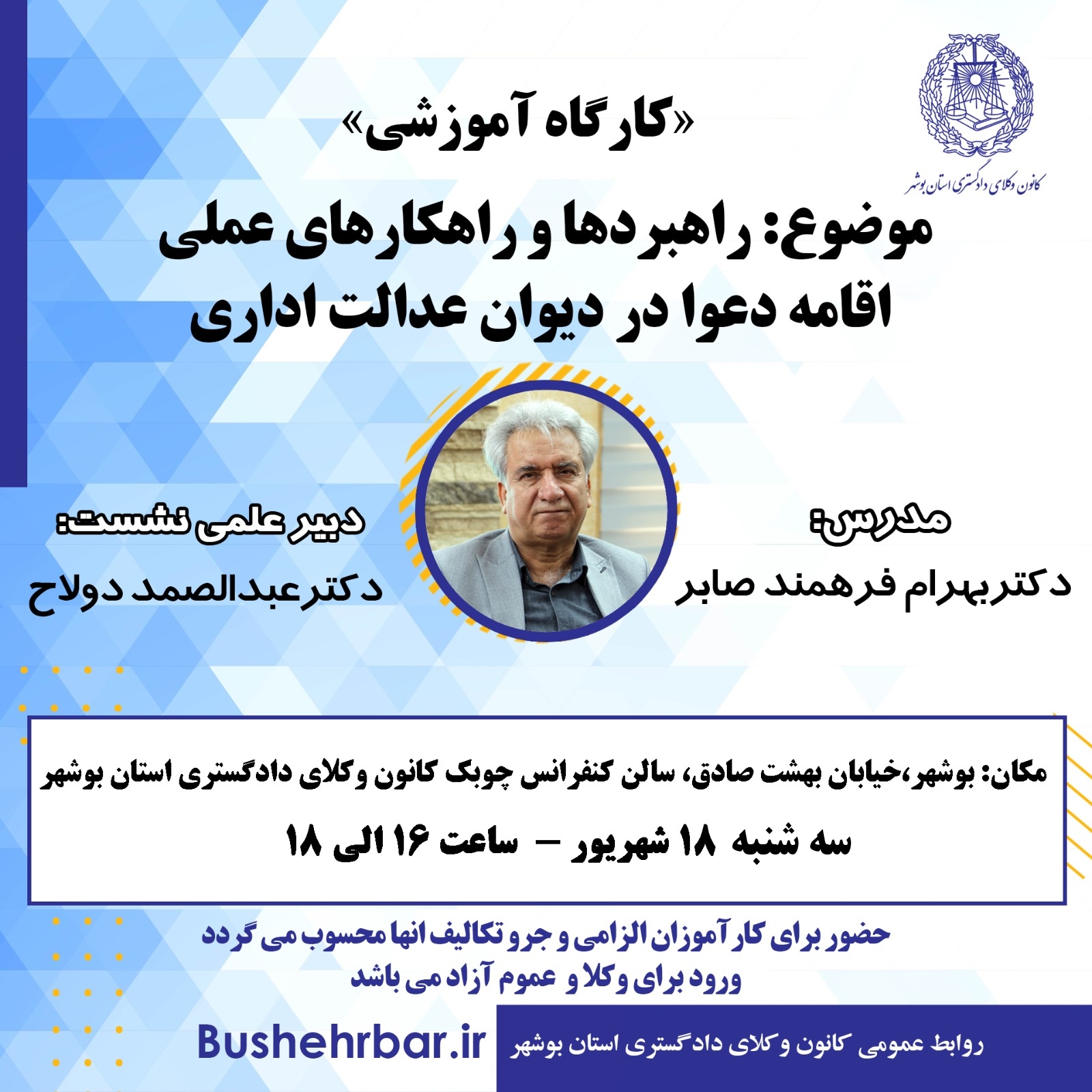 مکان: بوشهر، کانون وکلای دادگستری استان بوشهر، سالن اجتماعات چوبک