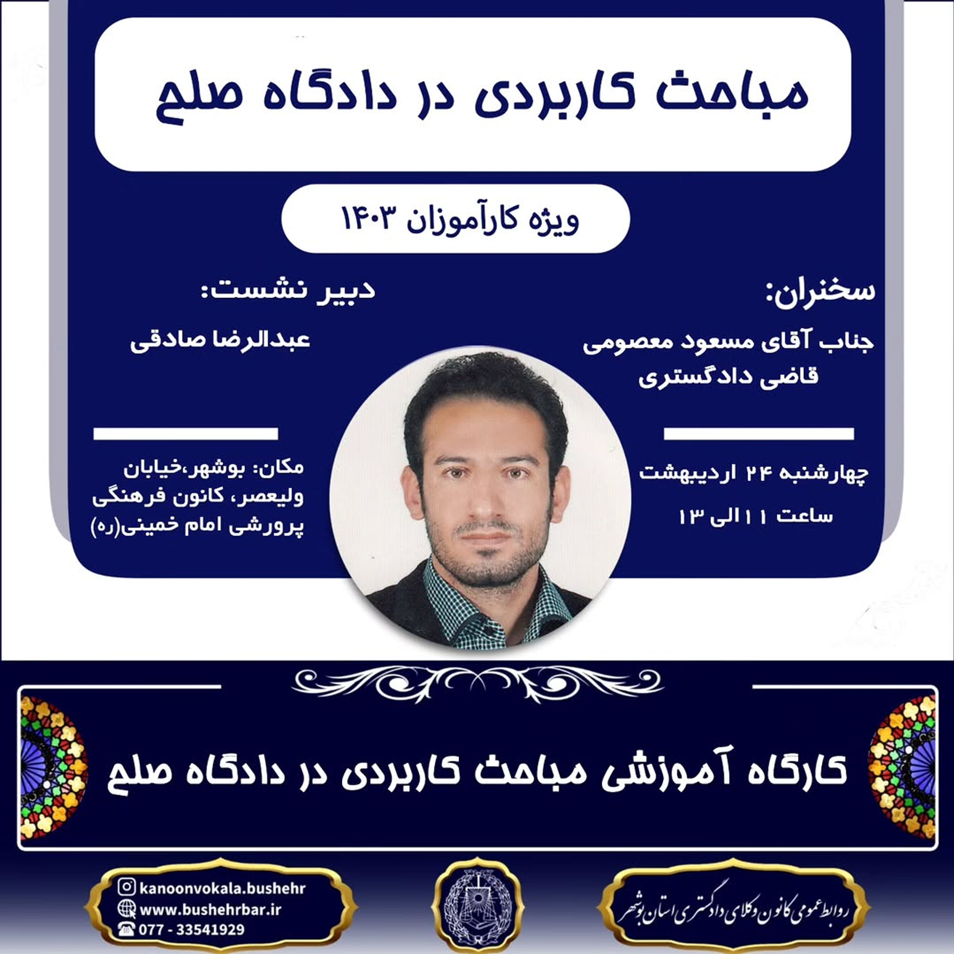 مرکز آموزش عالی علمی کاربردی وکلای دادگستری مرکز با همکاری کانون وکلای دادگستری استان بوشهر برگزار میکند: