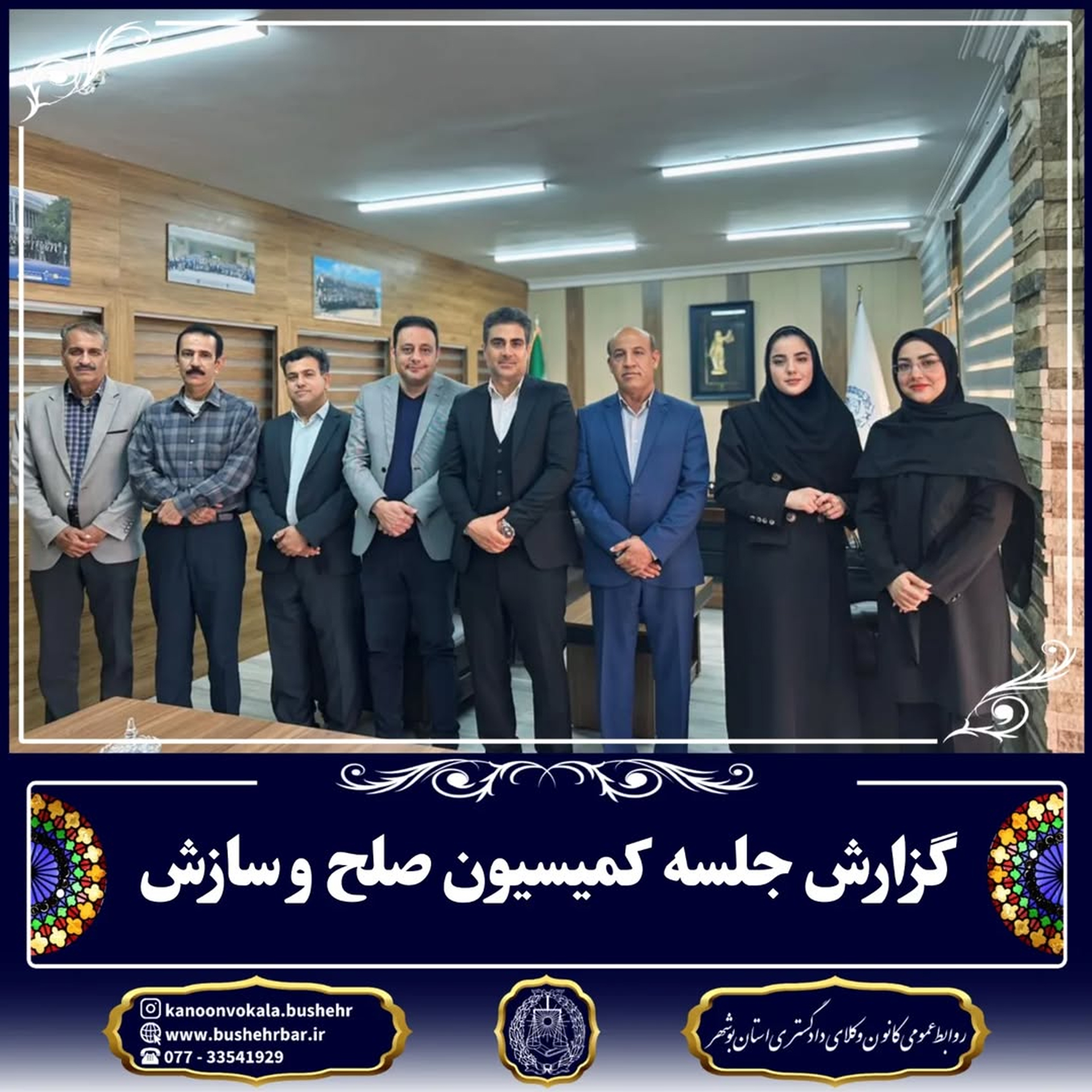 در بیست و ششم آذر ۱۴۰۳ دومین جلسهی کمیسیون صلح و سازش با حضور دکتر شهریاری ریاست کانون و آقای مهدی بنه گزی نایب رئیس و سرکار خانم دکتر جهانفر دبیر هیئت مدیره و اعضای کمیسیون آقایان علی رضا ریشهری، عبدالرحمن کازرانی، جنابان رنجبر، بهزاد مظفری و سرکار خانم فرشته مظفری تشکیل گردید