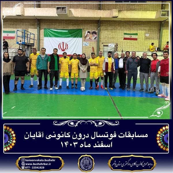 مسابقات فوتسال درون کانونی آقایان در روز چهارشنبه ۱۵ اسفند ۱۴۰۳ با همت کمیسیون ورزش آقایان در سالن کارگر بوشهر آغاز شد. در این روز از ساعت ۲۰:۳۰ تیمهای «دیوان» و «کارآموزان ۴۰۳» و از ساعت ۲۲ تیمهای «پیشکسوتان» و «قانون» به رقابت پرداختند. در روز پنجشنبه ۱۶ اسفند ۱۴۰۳ و از ساعت ۱۷:۳۰ با بازی تیمهای «دیوان» و «کاراموزان ۴۰۳» و تیمهای «پیشکسوتان» و «عدالت» این مسابقات ادامه یافت. در روز جمعه ۱۷ اسفند و از ساعت ۱۷:۳۰ تیمهای «عدالت» و «قانون» به مصاف هم خواهند رفت. حضور تمام علاقهمندان جهت تماشای مسابقه آزاد است.