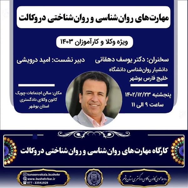 کارگاه مهارتهای روانشناسی و روانشناختی در وکالت سخنران: دکتر یوسف دهقانی دانشیار روانشناسی دانشگاه خلیج فارس بوشهر دبیر نشست: امید درویشی زمان: پنجشنبه ۱۴۰۳/۱۲/۲۳ ساعت ۹ الی ۱۱ مکان: سالن اجتماعات چوبک کانون وکلای دادگستری استان بوشهر