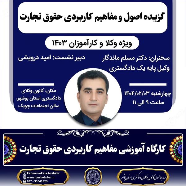 کارگاه آموزشی مفاهیم کاربردی حقوق تجارت موضوع:گزیدهاصول و مفاهیم کاربردی حقوق تجارت سخنران: دکتر مسلم ماندگار وکیل پایه یک دادگستری دبیر نشست امید درویشی زمان:چهارشنبه ۱۴۰۴/۲/۳ ساعت ۹الی ۱۱ مکان:کانون وکلای دادگستری استان بوشهر ، سالن اجتماعات چوبک