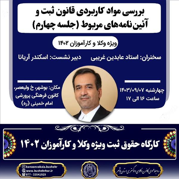 کارگاه بررسی مواد کاربردی قانون ثبت و آئیننامههای مربوط (جلسه چهارم) سخنران : استاد عابدین غریبی دبیر نشست : اسکندر آریانا زمان : روز چهارشنبه مورخ ۱۴۰۳/۰۹/۰۷ ساعت ۱۶ الی ۱۷ مکان : بوشهر، خ ولیعصر، کانون فرهنگی پرورشی امام خمینی(ره)