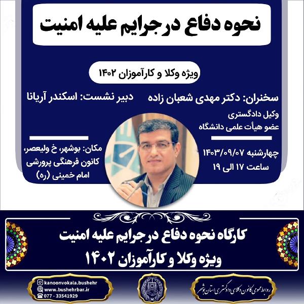 کارگاه نحوه دفاع در جرایم علیه امنیت سخنران : دکتر مهدی شعبان زاده وکیل دادگستری عضو هیأت علمی دانشگاه دبیر نشست : اسکندر آریانا زمان : روز چهارشنبه مورخ ۱۴۰۳/۰۹/۰۷ ساعت ۱۷ الی ۱۹ مکان : بوشهر، خ ولیعصر، کانون فرهنگی پرورشی امام خمینی(ره)
