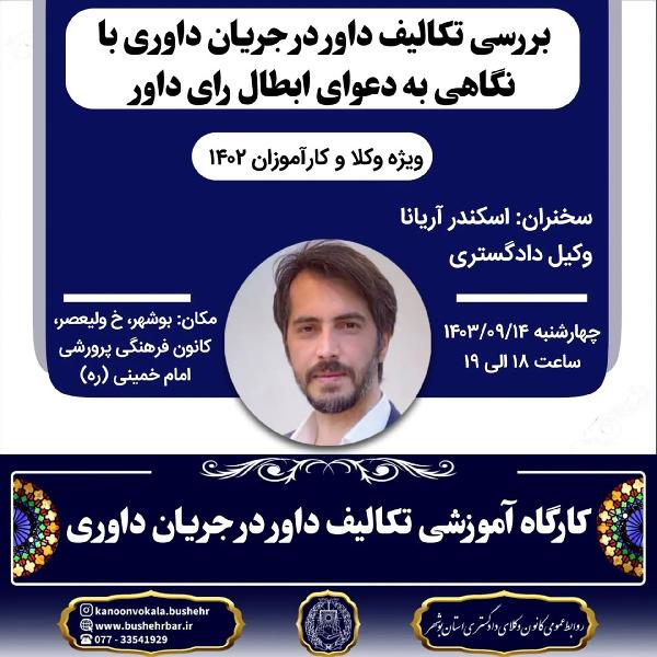 کارگاه آموزشی بررسی تکالیف داور در جریان داوری با نگاهی به دعوای ابطال رای داور سخنران : اسکندر آریانا (وکیل دادگستری) ویژه وکلا و کارآموزان ۱۴۰۲ زمان چهارشنبه ۱۴۰۳/۹/۱۴ ساعت ۱۸ الی ۱۹ مکان: بوشهر ، خ وليعصر ، كانون فرهنگي پرورشي امام خميني ( ره )