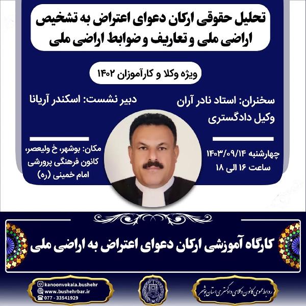 کارگاه آموزشی تحلیل حقوقی ارکان دعوای اعتراض به تشخیص اراضی ملی و تعاریف و ضوابط اراضی ملی سخنران: استاد نادر آران دبیر نشست: اسکندر آریانا ویژه وکلا و کارآموزان ۱۴۰۲ زمان چهارشنبه ۱۴۰۳/۹/۱۴ ساعت ۱۶ الی ۱۸ مکان: بوشهر ، خ وليعصر ، كانون فرهنگي پرورشي امام خميني ( ره )