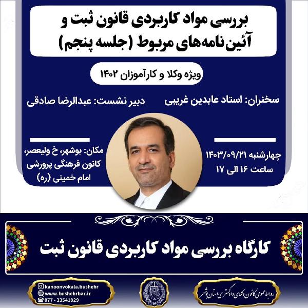 کارگاه آموزشی بررسی مواد کاربردی قانون ثبت و آئین نامه های مربوط (جلسه پنجم) سخنران: استاد عابدین غریبی دبیر نشست: عبدالرضا صادقی زمان: چهارشنبه ۱۴۰۳/۰۹/۲۱ ساعت ۱۶ الی ۱۷ مکان: بوشهر، خ وليعصر کانون فرهنگی پرورشي امام خمینی (ره)