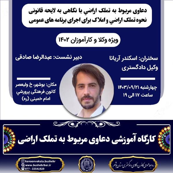 کارگاه آموزشی دعاوی مربوط به تملک اراضي با نگاهی به لایحه قانونی نحوه تملک اراضي و املاک برای اجرای برنامه های عمومی سخنران: اسکندر آریانا وکیل دادگستری دبیر نشست: عبدالرضا صادقی زمان: چهارشنبه ۱۴۰۳/۰۹/۲۱ ساعت ۱۷ الی ۱۹ مکان: بوشهر، خ وليعصر کانون فرهنگی پرورشي امام خمینی (ره)