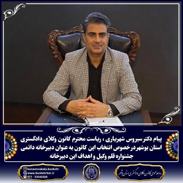 پیام دکتر سیروس شهریاری ، ریاست محترم کانون وکلای دادگستری استان بوشهر در خصوص انتخاب این کانون به عنوان دبیرخانه دائمی جشنواره قلم وکیل و اهداف این دبیرخانه دبیرخانه جشنواره قلم وکیل و کانون وکلای دادگستری استان بوشهر: با نام و یاد خدا و با توکل به او که همیشه همراه ماست