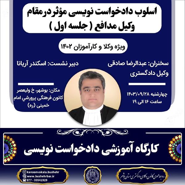 کارگاه آموزشی اسلوب دادخواست نویسی مؤثر در مقام وکیل مدافع ( جلسه اول ) سخنران: عبدالرضا صادقی وکیل دادگستری دبیر نشست: اسکندر آریانا چهارشنبه ۱۴۰۳/۰۹/۲۸ ساعت ۱۶ الی ۱۹