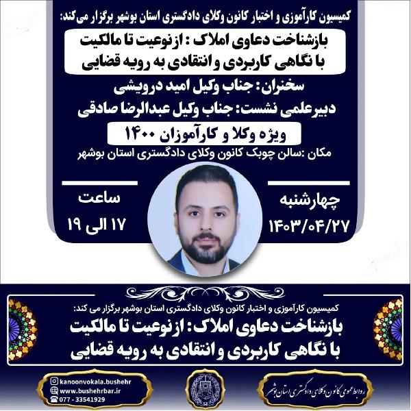 در جلسه هم اندیشی مورخ ششم تیرماه ۱۴۰۳ خورشیدی که به میزبانی دادگستری کل استان بوشهر و به مناسبت هفته قوه قضاییه تشکیل شد، اعضا حاضر چالش های پیش روی قوه قضاییه و مشکلات روز دادگاهها را با رئیس کل محترم و معاونین گرامی ایشان در میان گذاشته شد و در این بین نمایندگان کانون وکلای دادگستری استان بوشهر ضمن اعلام وجود مشکل حاد در اجرای احکام مدنی واعتراض مکرر همکاران در خواست نمودند