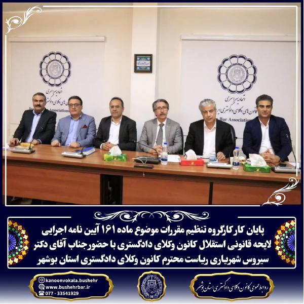 پایان کار کارگروه تنظیم مقررات موضوع ماده ۱۶۱ آیین نامه اجرایی لایحه قانونی استقلال کانون وکلای دادگستری با حضور جناب آقای دکتر سیروس شهریاری ریاست محترم کانون وکلای دادگستری استان بوشهر