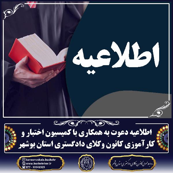 اطلاعیه دعوت به همکاری با کمیسیون اختبار و کارآموزی کانون وکلای دادگستری استان بوشهر