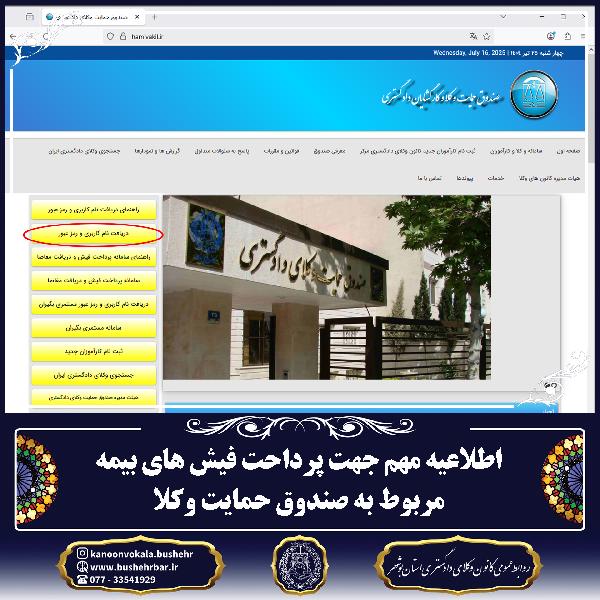 احتراماً، به اطلاع میرساند جهت پرداخت فیشهای بیمه مربوط به صندوق حمایت وکلا، لازم است مراحل زیر را بهدقت انجام دهید: 🔺 توجه مهم: سالانه چهار فیش برای هر عضو در سامانه بارگذاری میشود. عدم پرداخت بهموقع هر یک از فیشها، مشمول ۲۵ درصد جریمه خواهد بود. 🔹 یادآوری: مهلت پرداخت فیش سهماهه اول سال جاری، تا پایان تیرماه میباشد. لطفاً در مهلت مقرر اقدام فرمایید.