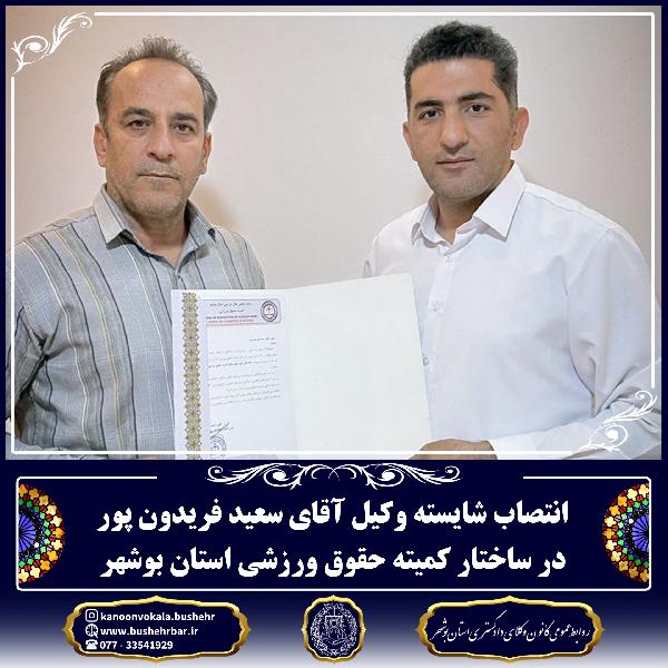 انتصاب شایسته وکیل آقای سعید فریدون پور در ساختار کمیته حقوق ورزشی استان بوشهر