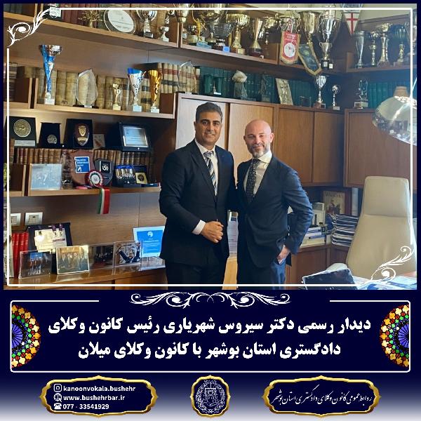 در تاریخ ۱۳ خرداد ۱۴۰۴ (۳ ژوئن ۲۰۲۵)، رئیس کانون وکلای دادگستری استان بوشهر، دکتر سیروس شهریاری، با رئیس کانون وکلای شهر میلان، آقای مارکو آکولا (Marco Accolla)، دیدار رسمی داشتند. آقای مارکو آکولا از سال ۲۰۲۳ به عنوان «رئیس کانون وکلای میلان» فعالیت میکنند و پیش از آن، از سال ۲۰۲۰ سمت «دبیر کانون» را بر عهده داشتند. در این دیدار، مباحثی همچون «اقتصاد حقوقی» و «آینده وکلای جوان» مورد بحث و تبادل نظر قرار گرفت.
