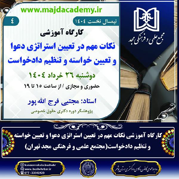 کارگاه آموزشی نکات مهم در تعیین استراتژی دعوا و تعیین خواسته و تنظیم دادخواست(مجتمع علمی و فرهنگی مجد تهران)