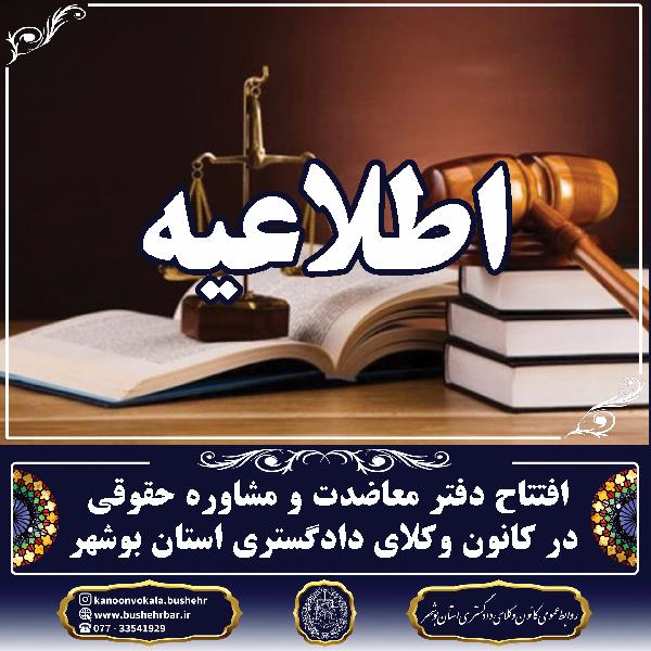 در راستای ایفای مسئولیت اجتماعی کانون وکلای دادگستری و با هدف گسترش عدالت، حمایت از حقوق اقشار نیازمند و فراهمسازی دسترسی سریعتر و آسانتر شهروندان به خدمات حقوقی، دفتر معاضدت و مشاوره حقوقی در ساختمان کانون وکلای دادگستری استان بوشهر راهاندازی شد.