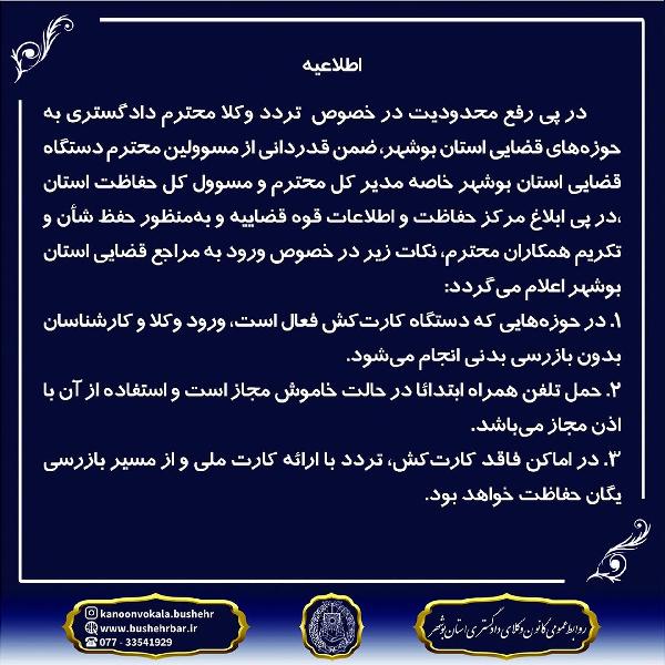 در پی رفع محدودیت در خصوص تردد وکلا محترم دادگستری به حوزههای قضایی استان بوشهر، ضمن قدردانی از مسوولین محترم دستگاه قضایی استان بوشهر خاصه مدیر کل محترم و مسوول کل حفاظت استان ،در پی ابلاغ مرکز حفاظت و اطلاعات قوه قضاییه و بهمنظور حفظ شأن و تکریم همکاران محترم، نکات زیر در خصوص ورود به مراجع قضایی استان بوشهر اعلام میگردد: