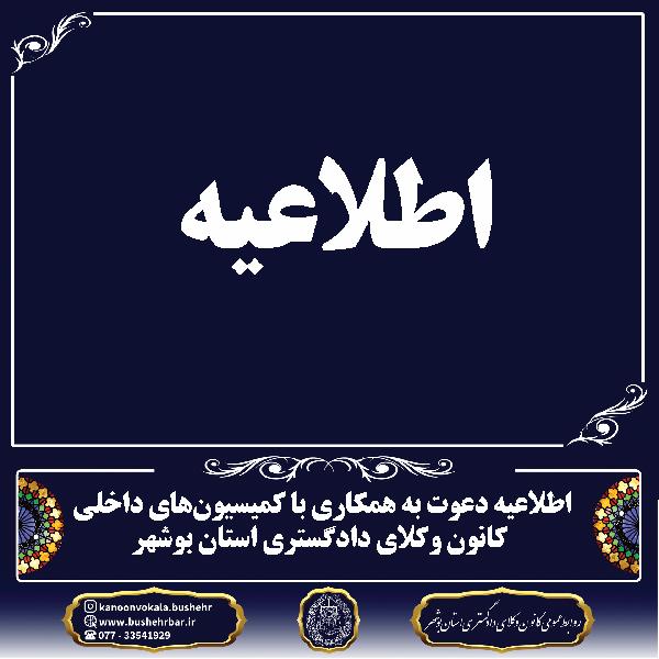 اطلاعیه دعوت به همکاری با کمیسیونهای داخلی کانون وکلای دادگستری استان بوشهر