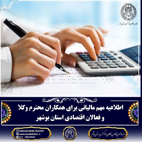 اطلاعیه مهم مالیاتی برای همکاران محترم وکلا و فعالان اقتصادی استان بوشهر